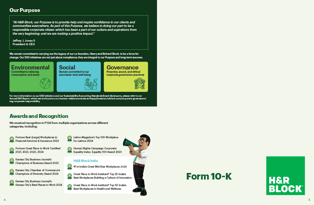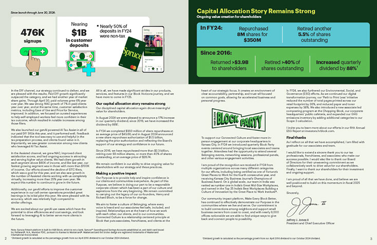 Fiscal 2024 was another successful year for H&R Block. CEO Jeff Jones explains in his letter to shareholders The Block Horizons 2025 Long Term Growth Strategy focusing on three imperatives: Small Business, Financial Products, and the Block Experience. A blended approach to their service that combines digital tools and human interaction, completely controlled by the customer.