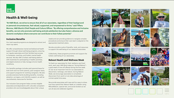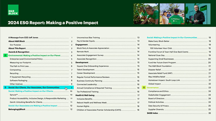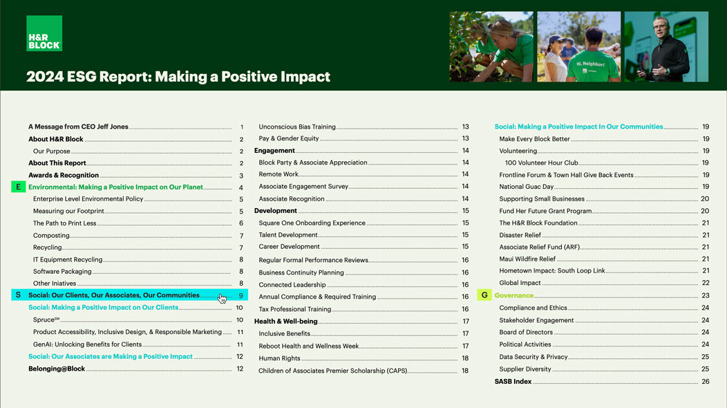 This year's report marks H&R Block’s fifth annual Environmental, Social, and Governance (ESG) report. H&R Block shares their initiatives and progress as part of this year's comprehensive review. The report aligns with the Sustainability Accounting Standards Board (SASB) Professional & Commercial Services and has consideration for other third-party agencies.