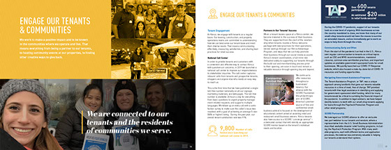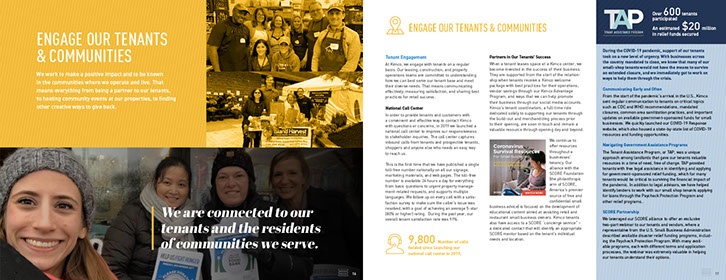The 2019 report introduces a redesign for Kimco's 7th Responsibility Report. At publication time the COVID-19 pandemic is in full affect around the world with the US in lockdown/stay at home orders while also experiencing a cultural awakening to systemic racism. Kimco reaffirms their commitment to diversity and continues to make strides in ethnic and gender inclusion while also helping their retail customers continue to do business during challenging times.