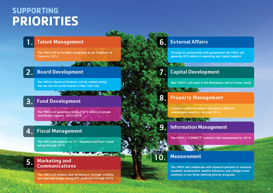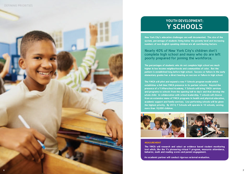 The YMCA of Greater New York produced this brochure to announce their strategic plan for the period 2012-2014. Titled Building the Foundations of Community the Y pursues its important community mission with three core motivations: Youth Development, Healthy Living and Social Responsibility. The brochure was designed with the new "Y" branding.