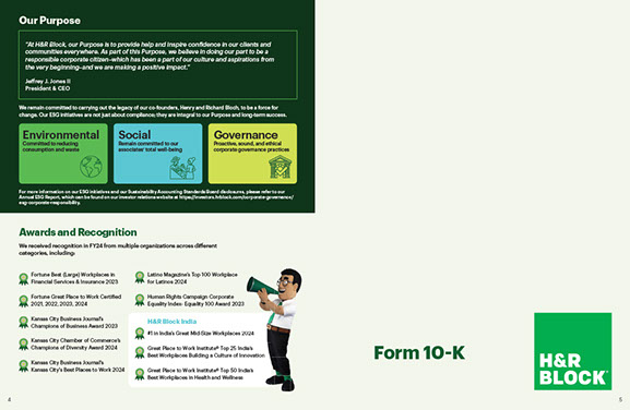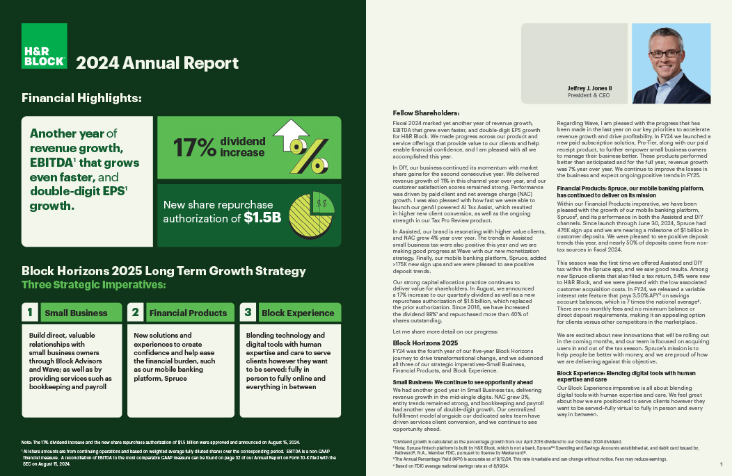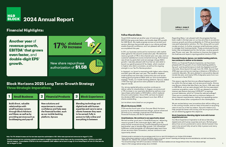 Fiscal 2024 was another successful year for H&R Block. CEO Jeff Jones explains in his letter to shareholders The Block Horizons 2025 Long Term Growth Strategy focusing on three imperatives: Small Business, Financial Products, and the Block Experience. A blended approach to their service that combines digital tools and human interaction, completely controlled by the customer.