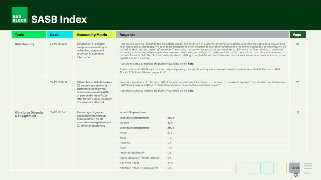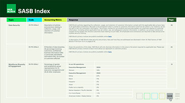This year's report marks H&R Block’s fifth annual Environmental, Social, and Governance (ESG) report. H&R Block shares their initiatives and progress as part of this year's comprehensive review. The report aligns with the Sustainability Accounting Standards Board (SASB) Professional & Commercial Services and has consideration for other third-party agencies.