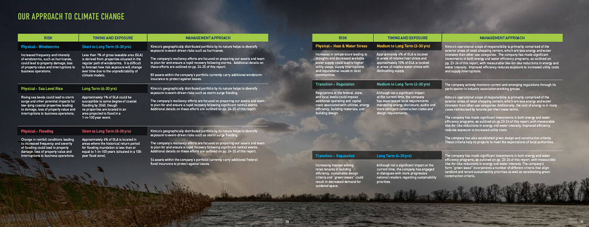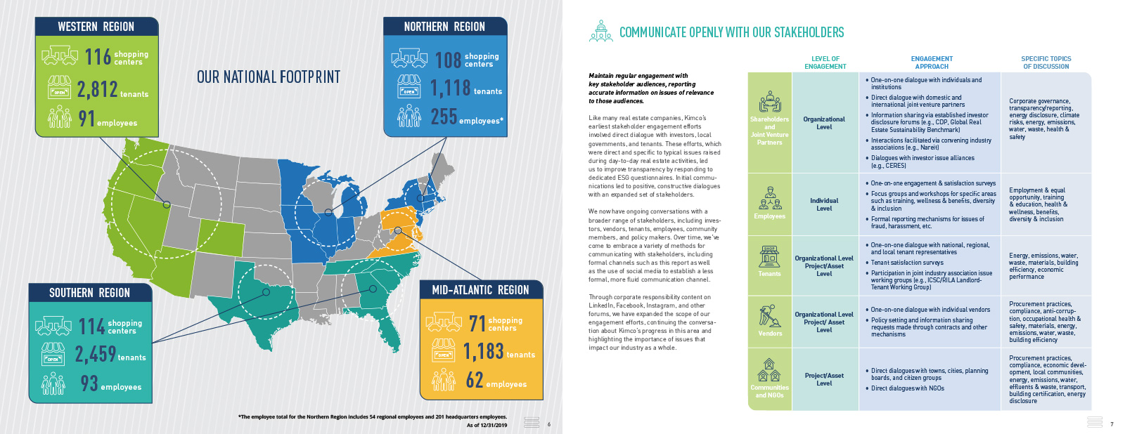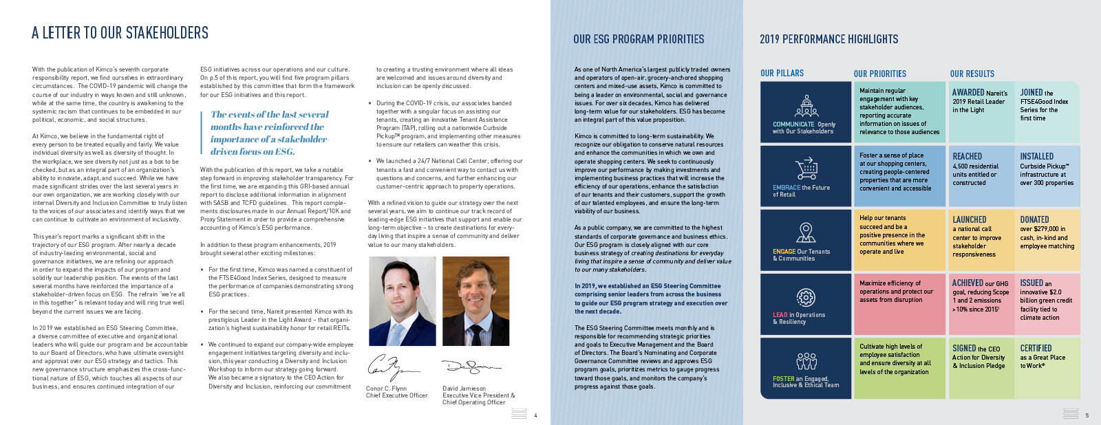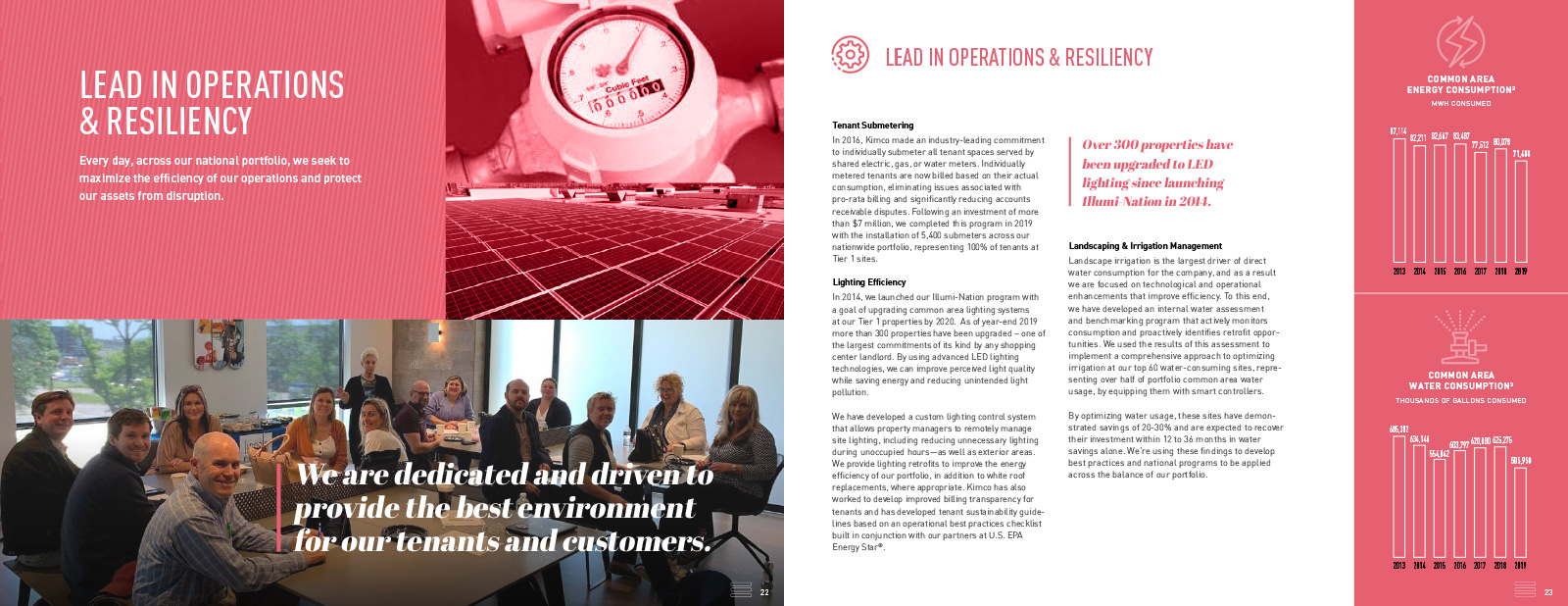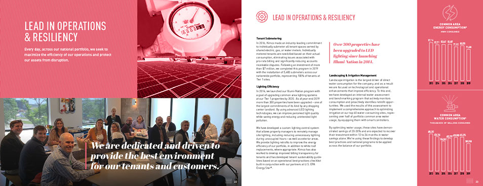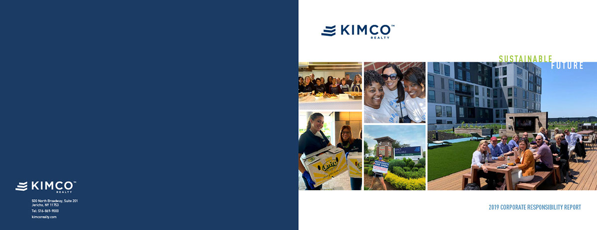 The 2019 report introduces a redesign for Kimco's 7th Responsibility Report. At publication time the COVID-19 pandemic is in full affect around the world with the US in lockdown/stay at home orders while also experiencing a cultural awakening to systemic racism. Kimco reaffirms their commitment to diversity and continues to make strides in ethnic and gender inclusion while also helping their retail customers continue to do business during challenging times.